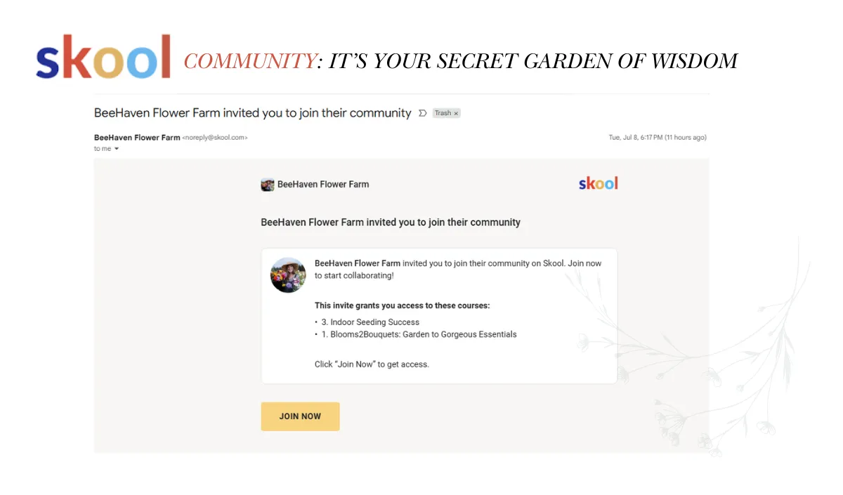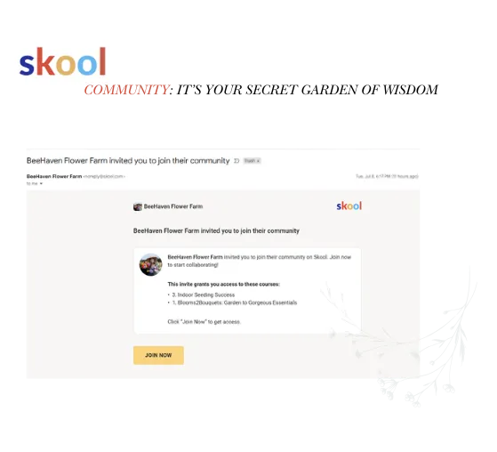 We offer an optional membership community and coaching add-on, providing you with an enriching opportunity to connect with fellow students and receive personalized guidance. In this exclusive mini-membership, you'll explore the art of growing your own cut flowers while engaging with our thriving community. Share your successes, pose questions, and gain inspiration from like-minded floral enthusiasts. Our coaching sessions offer valuable insights and tailored support to enhance your floral design journey. Join us and elevate your experience by becoming part of a passionate community dedicated to cultivating creativity and nurturing growth in the world of floral design.
